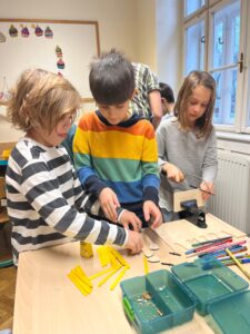 In klassenübergreifenden Gruppen wurde gemalt, gebastelt, gebaut, gestaltet und ausprobiert. Ob mit Papier, Karton, Stoffen oder Recyclingmaterial – der Fantasie waren keine Grenzen gesetzt. Mit großer Begeisterung und viel Engagement entstanden dabei vielfältige und beeindruckende Kunstwerke, wie Ritterburgen, Traumkinderzimmer und neue Dekoration.