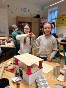 In klassenübergreifenden Gruppen wurde gemalt, gebastelt, gebaut, gestaltet und ausprobiert. Ob mit Papier, Karton, Stoffen oder Recyclingmaterial – der Fantasie waren keine Grenzen gesetzt. Mit großer Begeisterung und viel Engagement entstanden dabei vielfältige und beeindruckende Kunstwerke, wie Ritterburgen, Traumkinderzimmer und neue Dekoration.